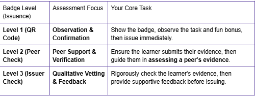 For these badges, the learners are responsible for assessing each other's work (evidence submitted by a third party). Your role is purely guidance and process verification.